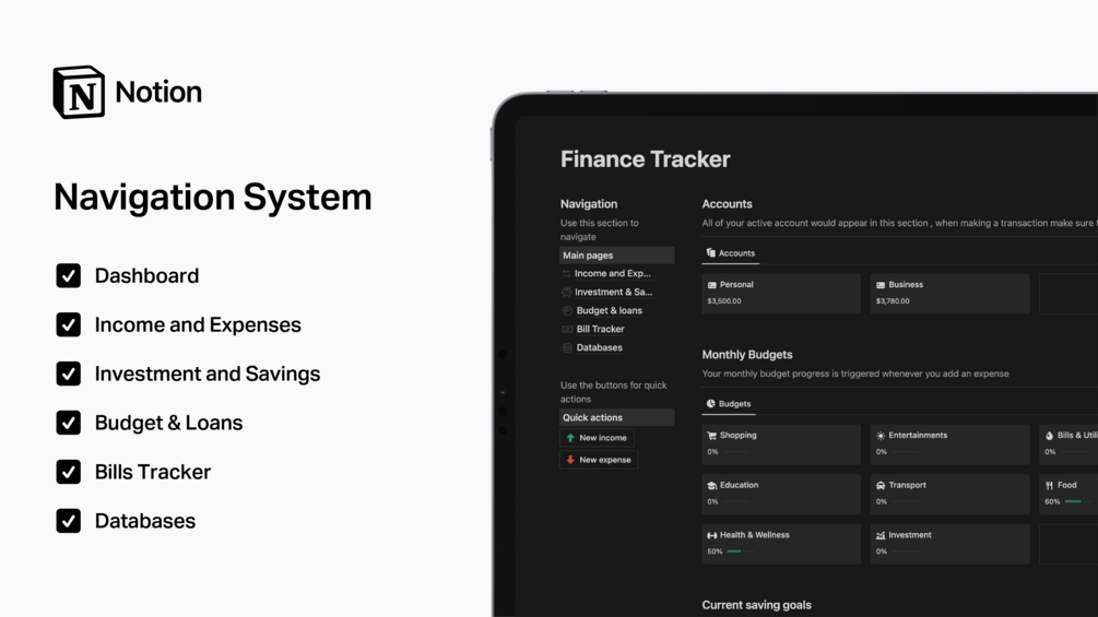 • What is Notion Finance Tracker? Notion Finance Tracker is a comprehensive and flexible tool designed for financial organization, visualization, and management. It brings all your financial data together, allowing you to manage income, expenses, investments, budgets, loans, and bills in one place.