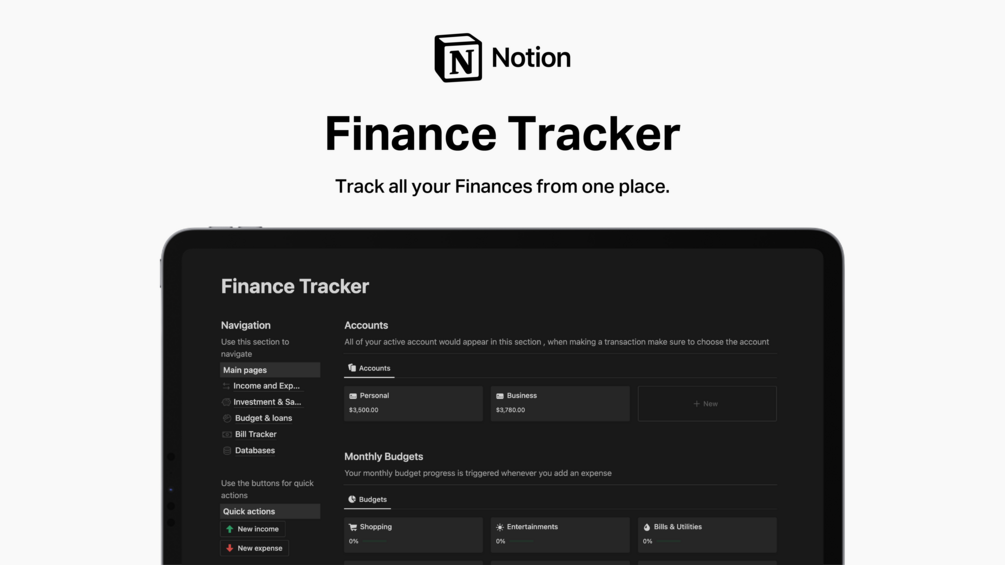- What is Notion Finance Tracker? Notion Finance Tracker is a comprehensive and flexible tool designed for financial organization, visualization, and management. It brings all your financial data together, allowing you to manage income, expenses, investments, budgets, loans, and bills in one place.