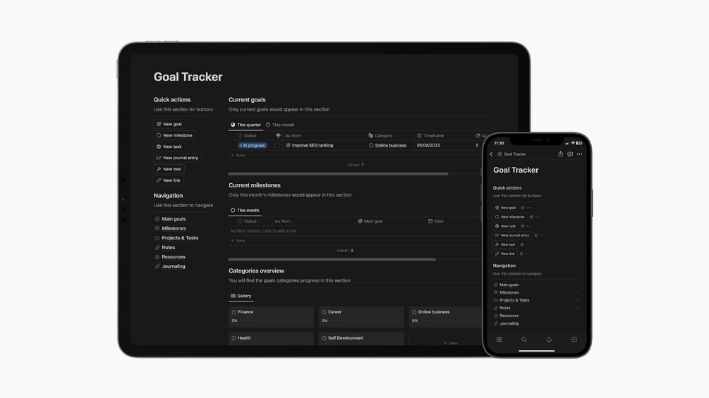 - What is Notion Goal Tracker, and how can it help me? Notion Goal Tracker is a powerful tool designed to help you set, track, and achieve your goals effectively. It provides a structured framework for defining your goals, breaking them into manageable milestones, managing projects and tasks, journaling your progress, and organizing resources and notes. Whether you want to boost your productivity, work towards personal aspirations, or manage your professional objectives, this tool can adapt to your needs and empower you to turn your goals into reality.